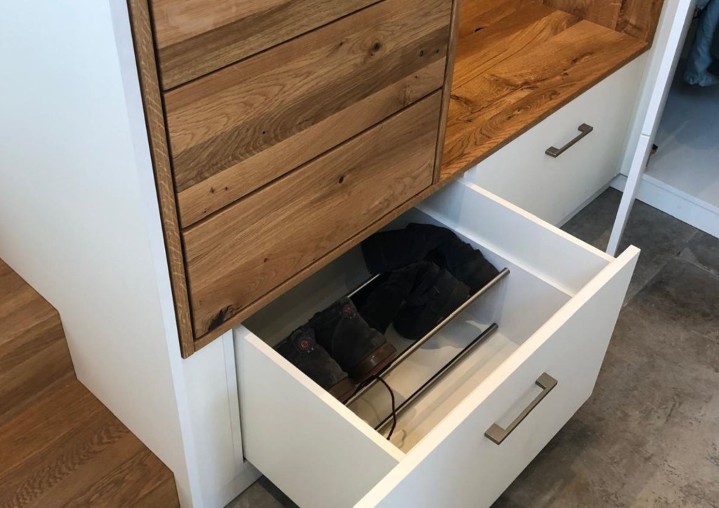 Die Nische in massiver geölter Eiche lässt den Eingangsbereich offener und wärmer wirken - und bietet zudem noch Platz zum Hinsetzen und Fertig-Machen, sowie weiteren Stauraum in den Schubläden und der Ablage.