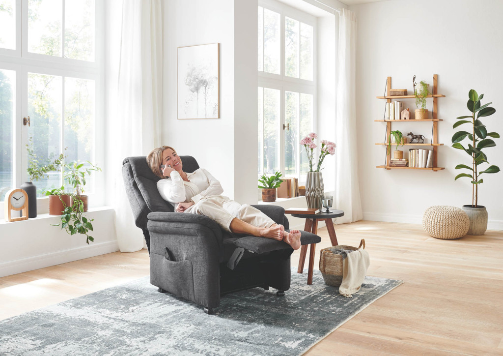 Dieser harmonisch gestaltete Relaxsessel ist in drei Größen erhältlich und bietet bereits in der Grundversion eine komfortable Verstellung von Beinauflage und Rückenlehne durch leichten Körperdruck. Auf Wunsch stehen alle Funktionen auch vollmotorisiert zur Verfügung. Für zusätzlichen Komfort und Sicherheit sorgt die integrierte Aufstehhilfe.