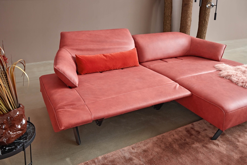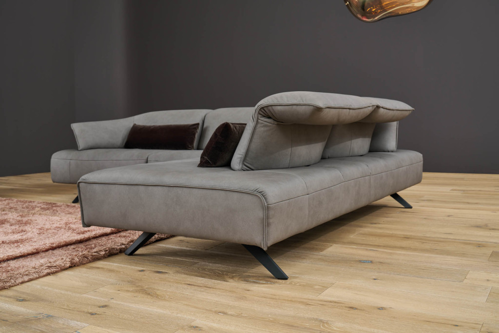Die erhöhte Bodenfreiheit sorgt für eine leichte, elegante Optik, während die elektrisch ausklappbare Beinauflage zusätzlichen Komfort bietet. Über einen seitlichen Kippschalter lässt sich die Relaxposition mühelos einstellen. Integrierte Kopfstützen erhöhen den Sitzkomfort und runden das durchdachte Gesamtbild ab.