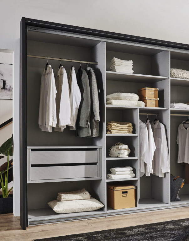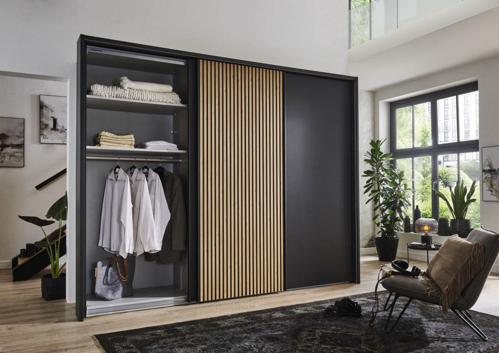 Entdecken Sie modernen Stauraum mit Stil: Der Schwebetürenschrank überzeugt durch einen eleganten Korpus und Außentüren im edlen Graphit-Dekor. Die mittlere Tür setzt mit dekorativen Lamellen in Bianco-Eiche Nachbildung ein besonderes Highlight und verleiht dem Design eine natürliche Note. Praktische Griffleisten in passendem Graphit-Dekor unterstreichen das zeitlose Erscheinungsbild. Hinter den drei leichtgängigen Türen verbirgt sich großzügiger Stauraum für Ihre Kleidung und Accessoires. Dieser Schrank vereint Funktionalität und Ästhetik – die ideale Wahl für Ihr Schlafzimmer.