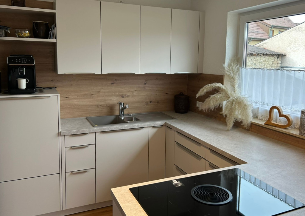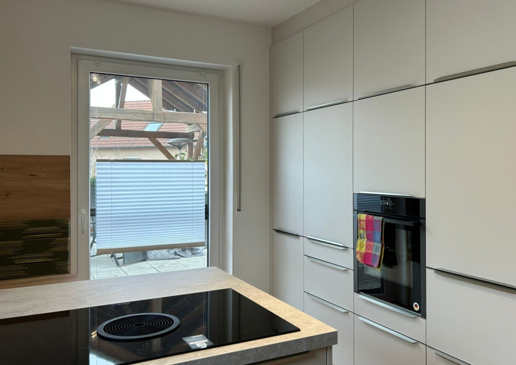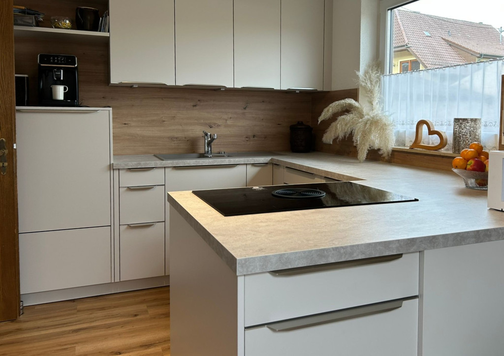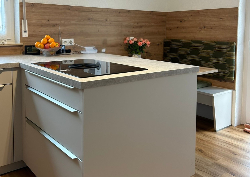 Im Zentrum der Küche befindet sich das moderne Kochfeld mit integriertem Muldenlüfter – ideal für offene Grundrisse und für alle, die auf eine klassische Dunstabzugshaube verzichten möchten, ohne Kompromisse bei der Leistung einzugehen. Die großzügigen Arbeitsflächen in Steinoptik in Kombination mit der Nischenrückwand in Holzoptik rundet das funktionale und ästhetische Konzept ab.