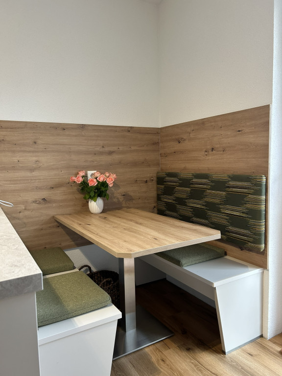 Diese individuell geplante Küche vereint modernes Design, hochwertige Materialien und intelligente Raumlösungen. Ein besonderes Highlight ist die integrierte Sitzecke aus Küchenmaterial, die in unserer hauseigenen Schreinerei gefertigt wurde. Sie schafft eine gemütliche, perfekt abgestimmte Erweiterung des Küchenraums und lädt zum Verweilen ein – ideal für den schnellen Kaffee am Morgen oder die gesellige Runde im Alltag.