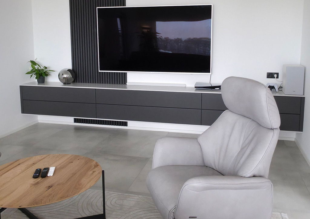 Ein besonderes Highlight ist das TV‑Lowboard mit schwebender Optik, das sich harmonisch in den Wohnraum einfügt. Die klaren Linien, hochwertige Materialien und die Kombination aus matten Oberflächen und strukturiertem Wandpaneel schaffen eine elegante und zugleich wohnliche Atmosphäre.
