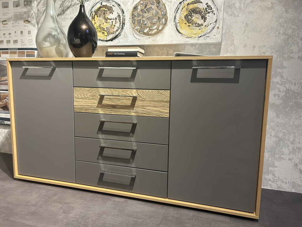 Korpus: Balkeneiche furniert // Front: Lack Manhattan // Griff: chrom (90908) // mit 5 Schubkästen mittig, Schub 2 in Riffholz-Absetzung