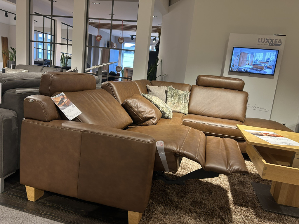 Leder: Cloudy Tabacco // Füße: P58-Eiche Bianco bodenfrei // Armlehne: M // Sitz: F2 mittel Federkern // Sitzhöhe: 48cm // Rücken echt
