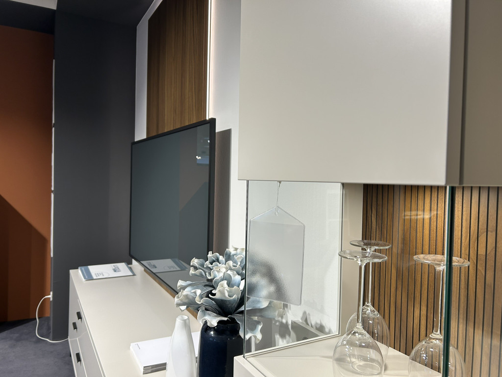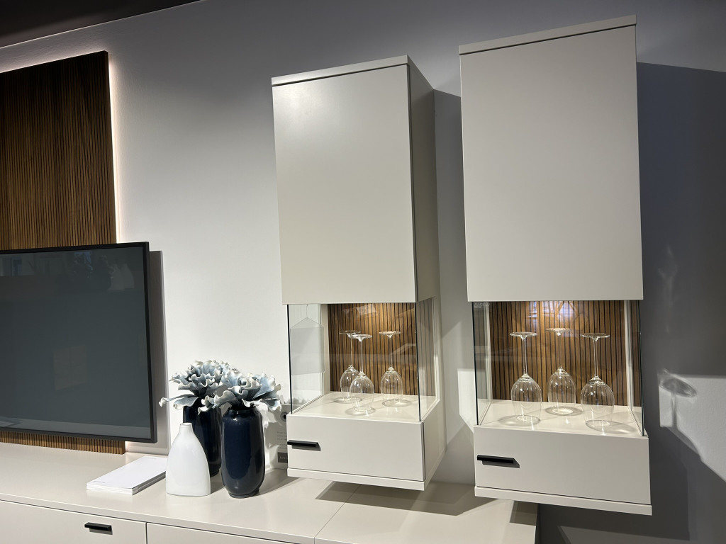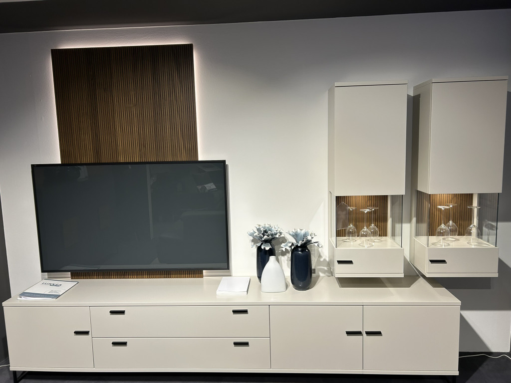 inkl. Deepline-Vitrinen-Rückwand, Paneel in Deepline, LED-Beleuchtung, Repeater, TV-Halterung starr und Funklichtschalter