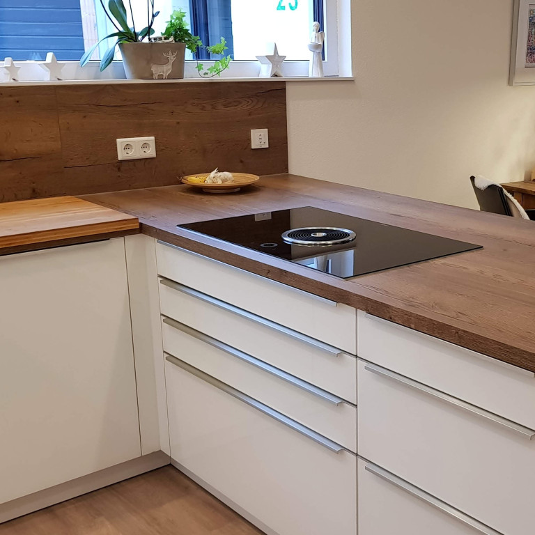 Diese Küche zeigt, dass man sich in der Gestaltung nicht an einen Stil halten muss, sondern auch kreativ verschiedene Elemente kombinieren kann. Die großen, schlichten Fronten, grifflosen Türen und klare Linien sorgen für einen modernen, puristischen Look. Die Arbeitsplatte aus Alteiche-Barrique und die passenden Rückwände verleihen der Küche Wärme und eine Atmosphäre, die man sonst eher vom modernen Country-Style kennt. Individuelle Lieblingsstücke wie der Esstisch aus Echtholz und der Apothekerschrank ergänzen den Raum und machen ihn zum perfekten Wohlfühlort!