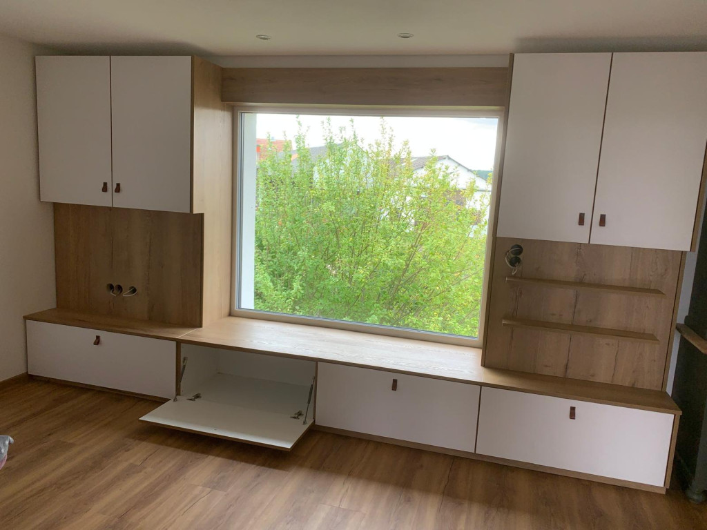 Mit diesem Projekt haben wir bewiesen, wie es geht! Die Sitzfläche des Fensters wurde erweitert, indem die Stauraumschränke daneben nahtlos an den Sitzplatz anschließen – und mit dem Abschluss über dem Fenster ein harmonisches Gesamtbild erzeugen.