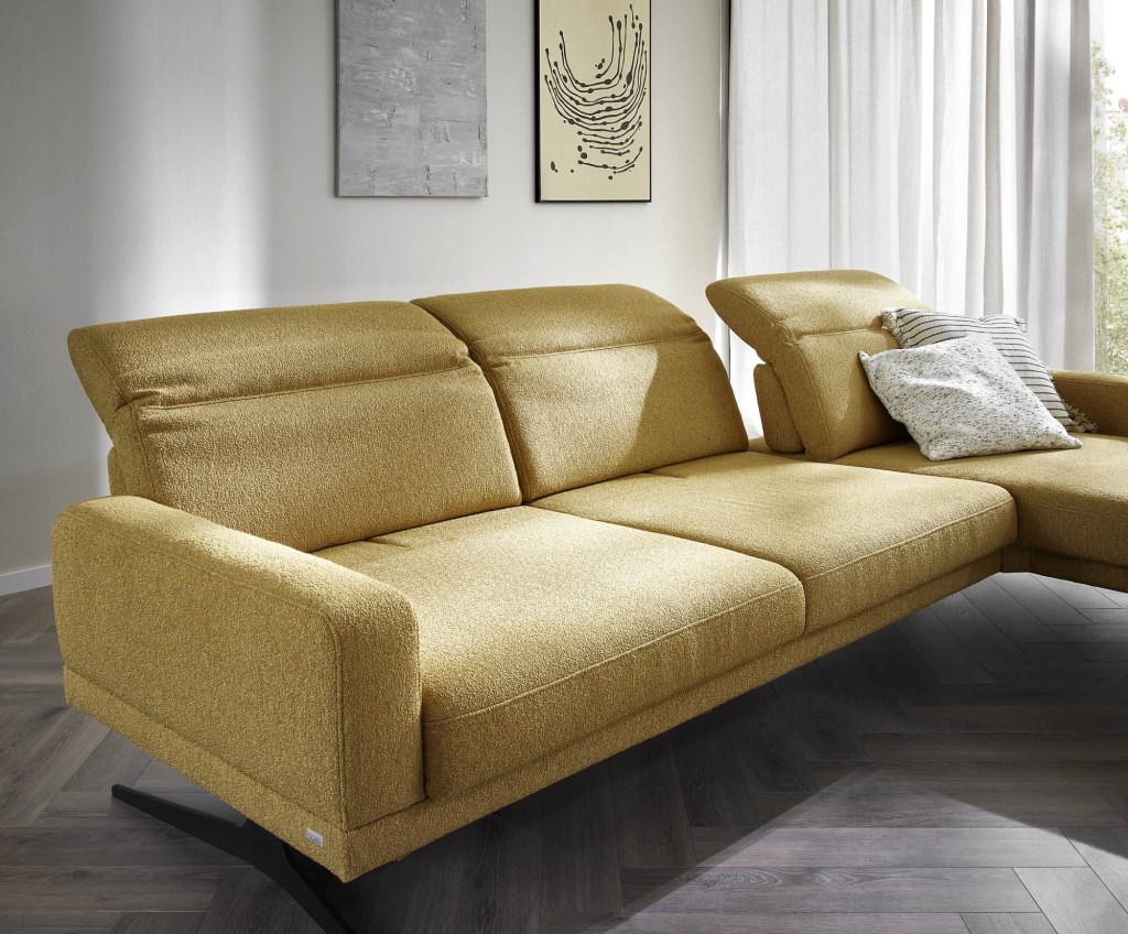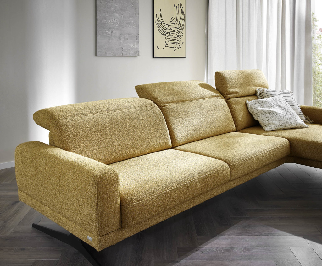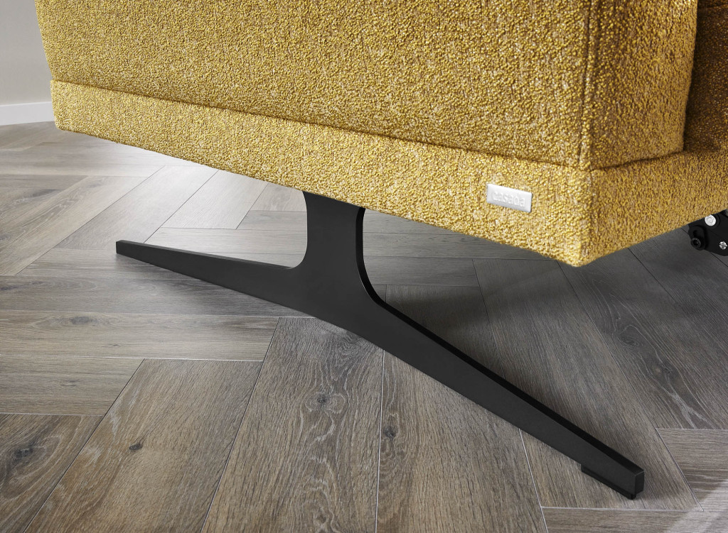 Das markante Metallgestell in Schwarz matt verleiht dem Sofa CALAU nicht nur optische Leichtigkeit, sondern sorgt auch für sicheren Stand. Die moderne Linienführung setzt ein klares Designstatement und hebt die gesamte Silhouette elegant vom Boden ab. Ein Fuß, der trägt – und beeindruckt.