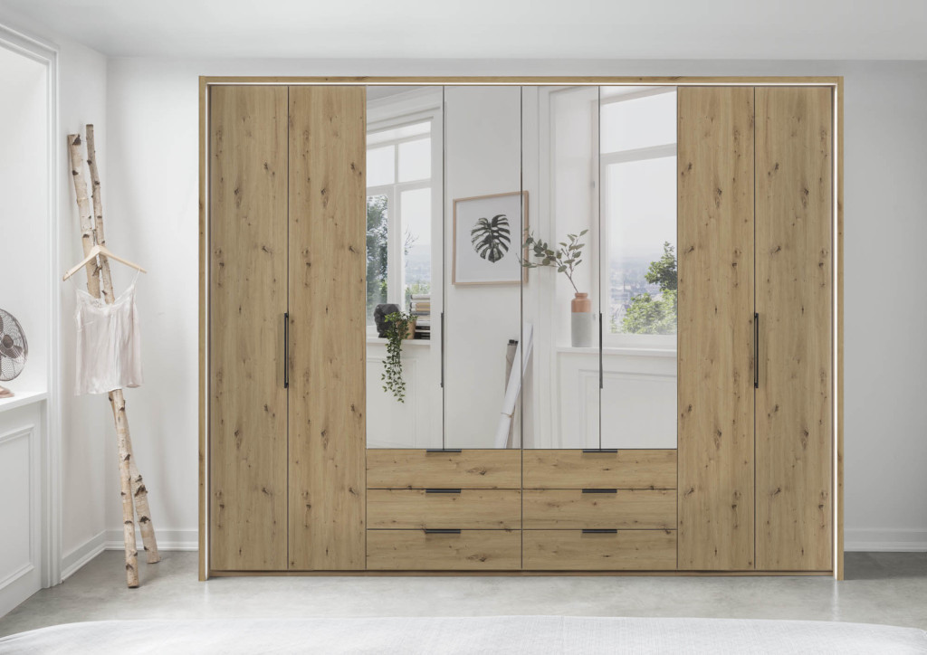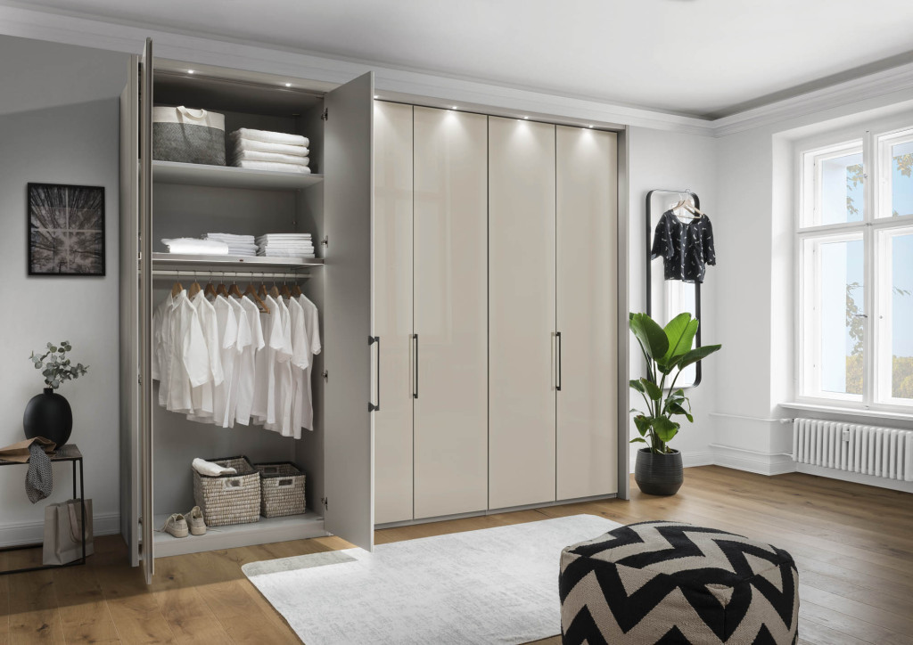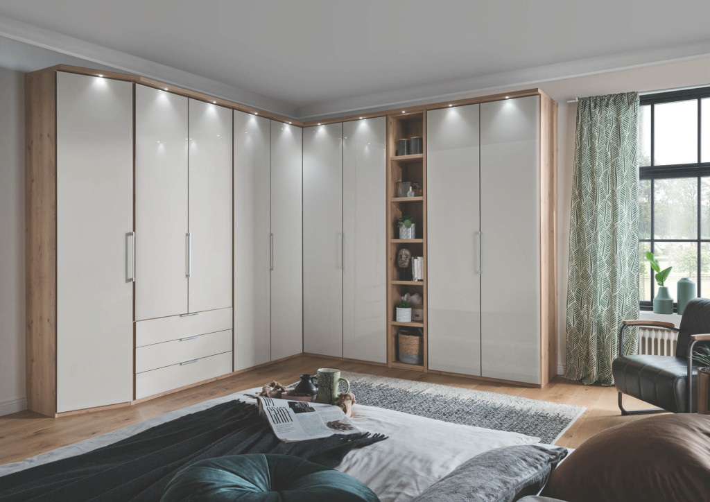 Das funktionale Schranksystem der Serie MONACO punktet mit frei zusammenstellbaren Korpus- und Frontausführungen. Entscheiden Sie sich für ein facettenreiches Dekor in Weiß, Champagner, Graphit, Kieselgrau oder Bianco-Eiche-Nachbildung, kombiniert mit Griffen in Chrom, Silber und Schiefer oder wählen Sie die Ausführung einer farbigen Glasfront, inklusive Kristallspiegel und einem harmonierenden Innenfarbton. Ob Drehtürenschränke, Falttürenschränke, voll ausgebaute Eckschränke mit zusätzlicher Kranzleiste, Abschlussschränke mit Drehtür oder passende Regalelemente - der Einrichtungsvielfalt sind mit der Möbelserie MONACO keine Grenzen gesetzt. Je nach Modell mit wechselseitig wählbaren Türanschlägen, mehrteiligen Auszügen und exklusivem Schrankzubehör versehen, weisen die Schrankelemente mit zwei Einlegeböden und einer Kleiderstange je Fach eine clevere Inneneinteilung auf.