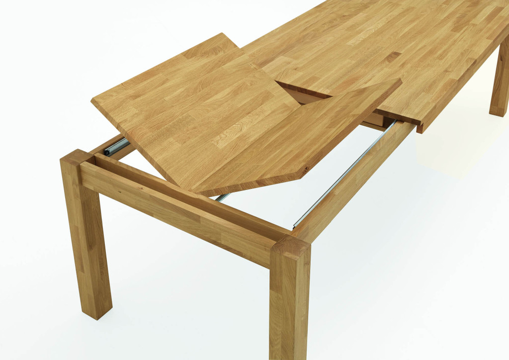 Eiche massiv geölt, Holzverlauf längst, massiv parkettverleimt, 1x Butterfly-Klappeinlage á 70 cm, Kopfauszug, LBH ca. 160(230)/90/76 cm