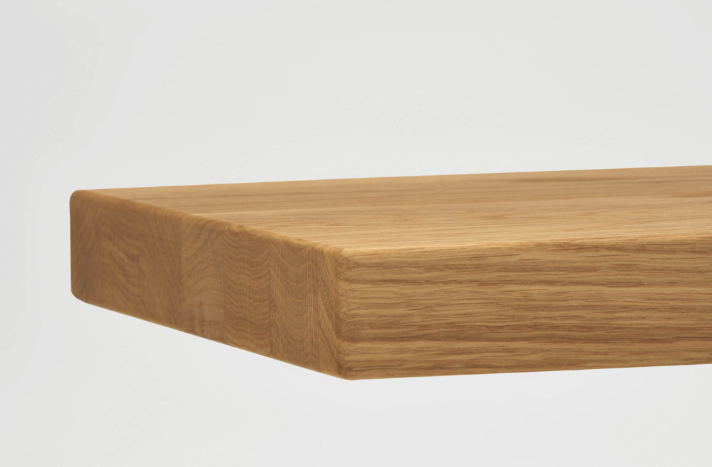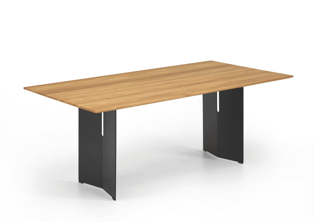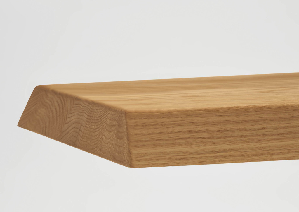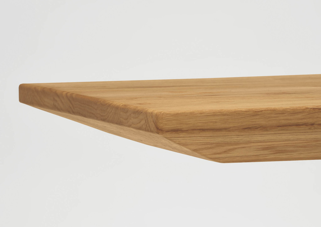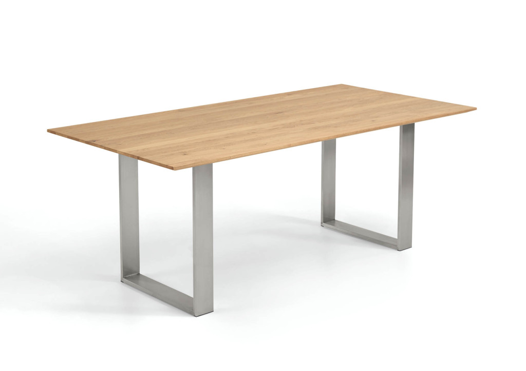 E113-49-057 - Tischplatte Eiche bianco massiv, 30mm, Plattenprofil mit Facette, Gestell Trapezkufe Edelstahl gebürstet LBH ca. 180/90/76cm