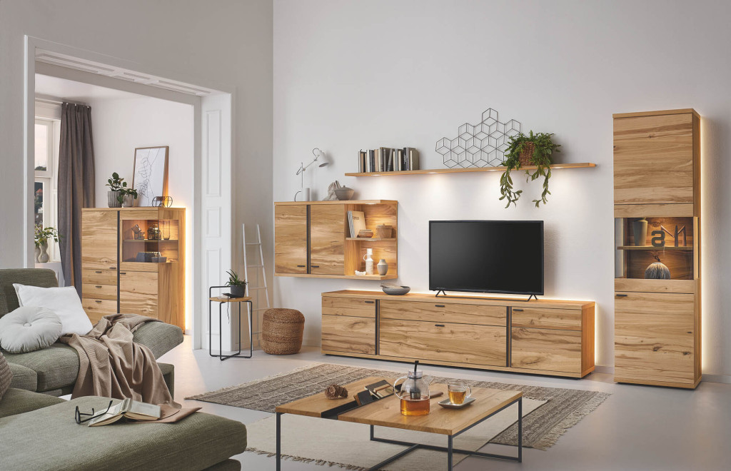 Eiche rustico hell geölt, Korpus und Front Echtholz furniert, Metallgriffe und -profile anthrazit matt, Beschläge mit Selbsteinzug und Dämpfung, Kombination, bestehend aus: