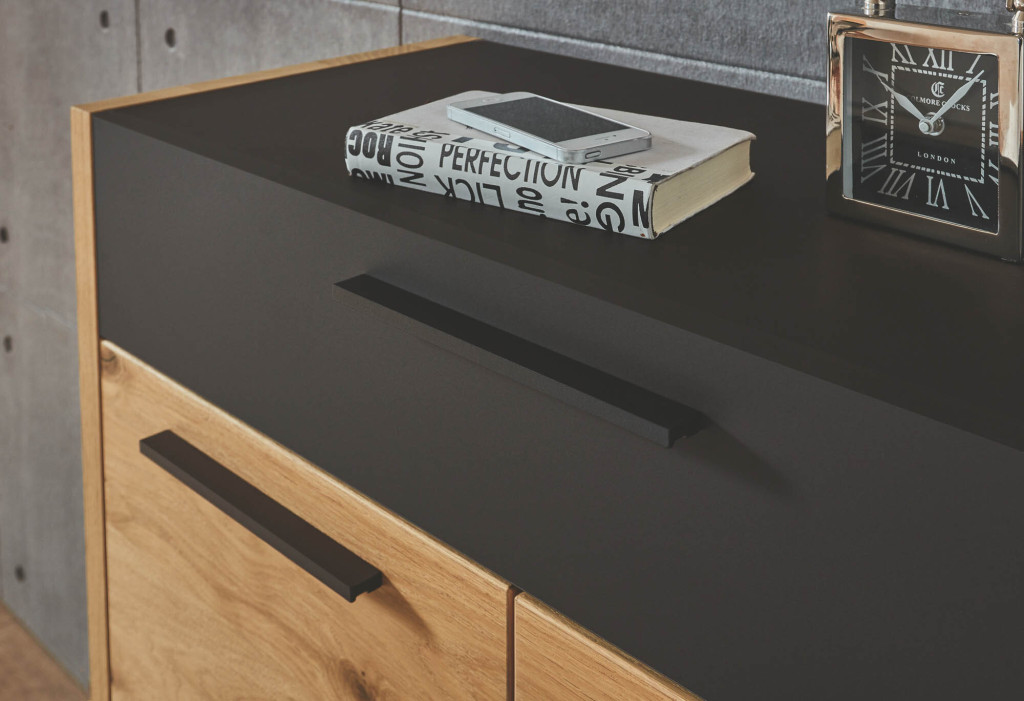 Fronten Balkeneiche furniert, Absetzungen Lack matt schwarz, Korpus Eiche bianco furniert, Beschläge schwarz, Schubkästen mit Vollauszug, bestehend aus: