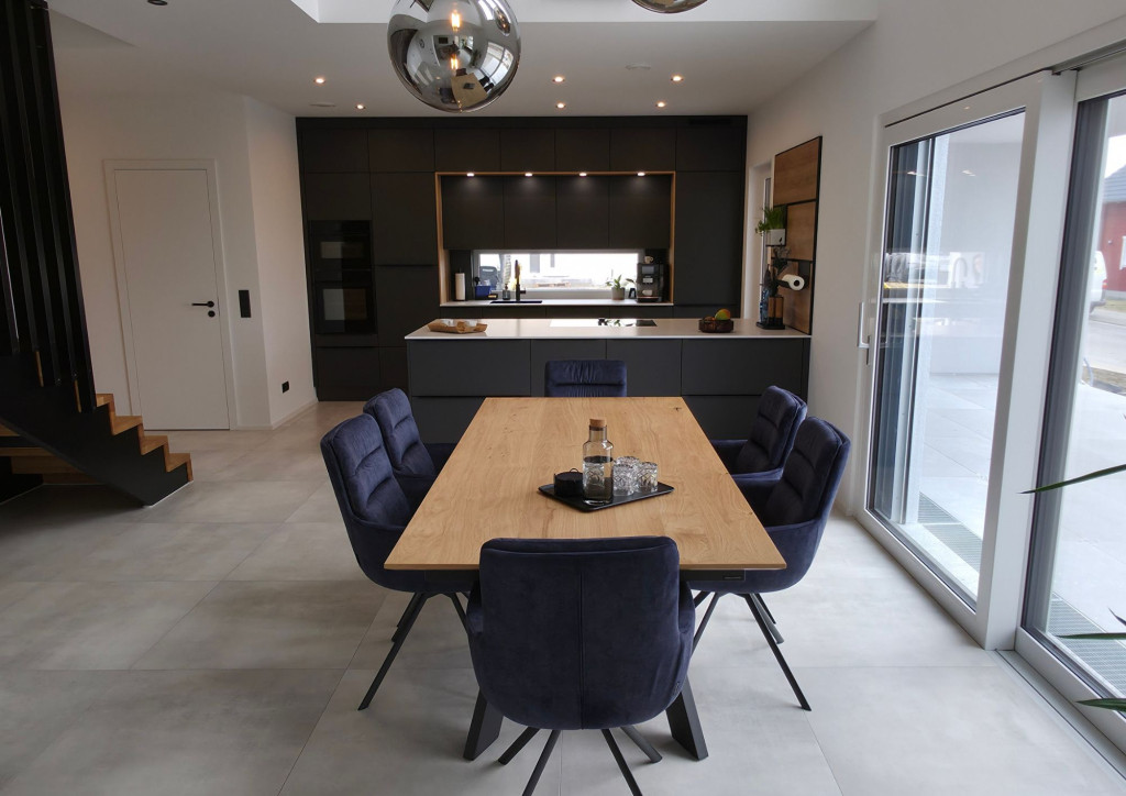 In diesem Haus in Löffelstelzen durften wir nicht nur die Küche einbauen, sondern auch einige weitere Räume im Haus einrichten: zum Beispiel dieses moderne Esszimmer.