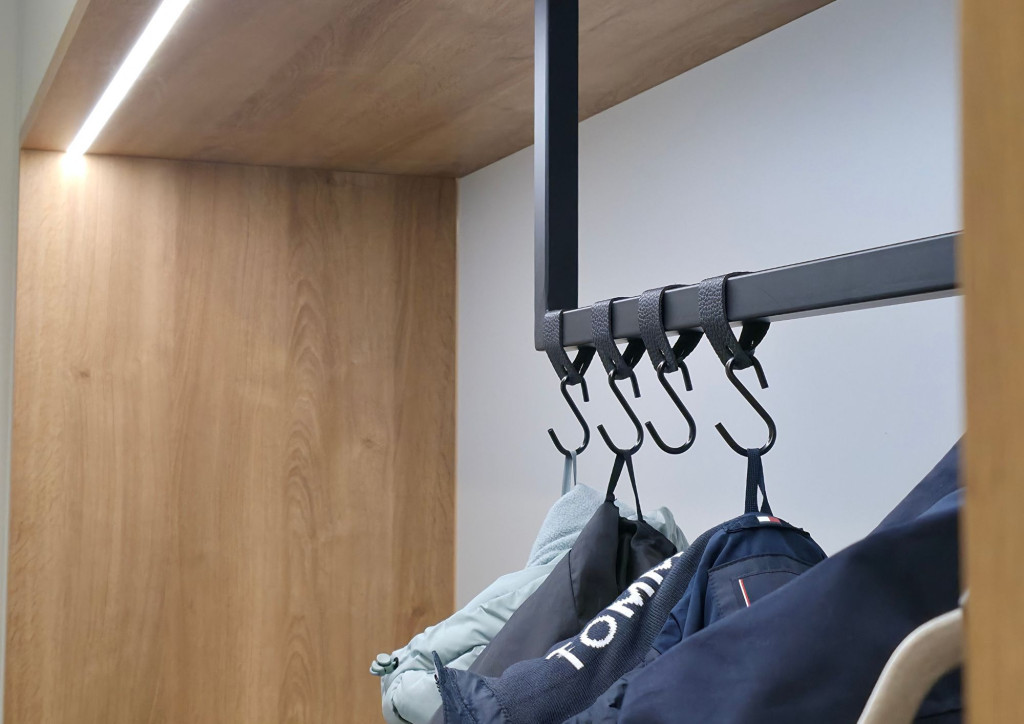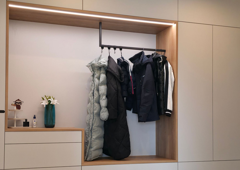 geschlossene Stauraumschränke und offene Kleiderstange