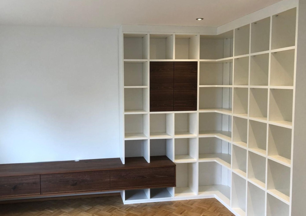Diese maßgefertigte Eck-Wohnwand aus unserer Schreinerei verbindet Tradition mit Moderne: das schlichte, weiße Eckregal wird mit massiven Altholz-Elemente ergänzt. Durch die klaren Linien und dünnen Wangen des TV-Boards wirkt das rustikale Holz modern und optisch leicht - dennoch geht der Charme des Altholzes nicht verloren!