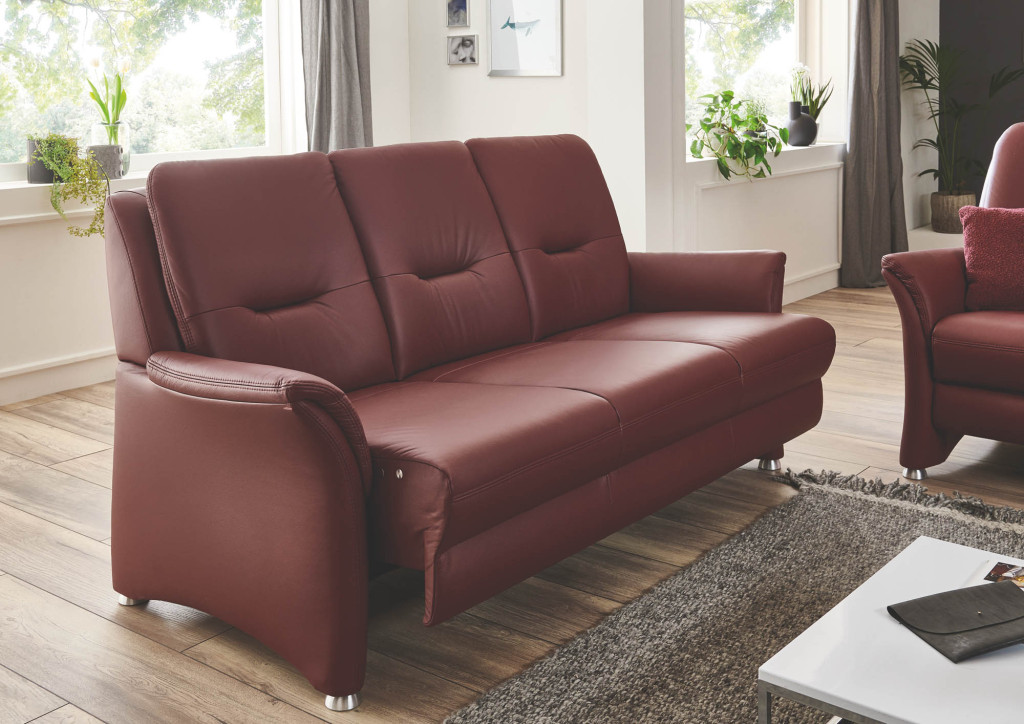 Semi-Anilin-Leder, Farbe brombeer, Doppelsteppnaht ohne Kontrastfaden, Sitz Kaltschaum, Rücken unecht, Metallfuß alufarbig, Sitzhöhe ca. 49 cm, Sitztiefe ca. 51 cm, bestehend aus: 3-Sitzer, BHT ca. 194/101/89 cm 2,5-Sitzer, BHT ca. 168/101/89 cm