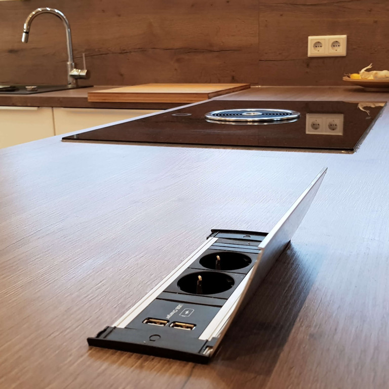 Elegant gelöst: Eine Steckdosenleiste in der Arbeitsplatte bietet nicht nur Strom für zwei Geräte, sondern auch zwei Anschlüsse für USB-Kabel. So können Sie etwa Smartphone oder Tablet gleichzeitig laden, wenn Sie Koch- oder andere Videos während des Kochens anschauen möchten.