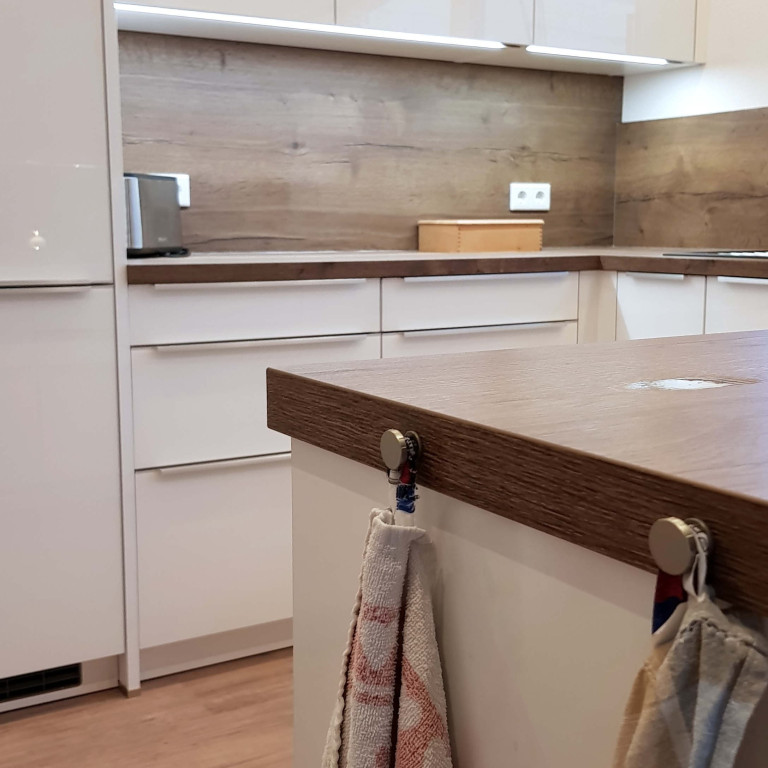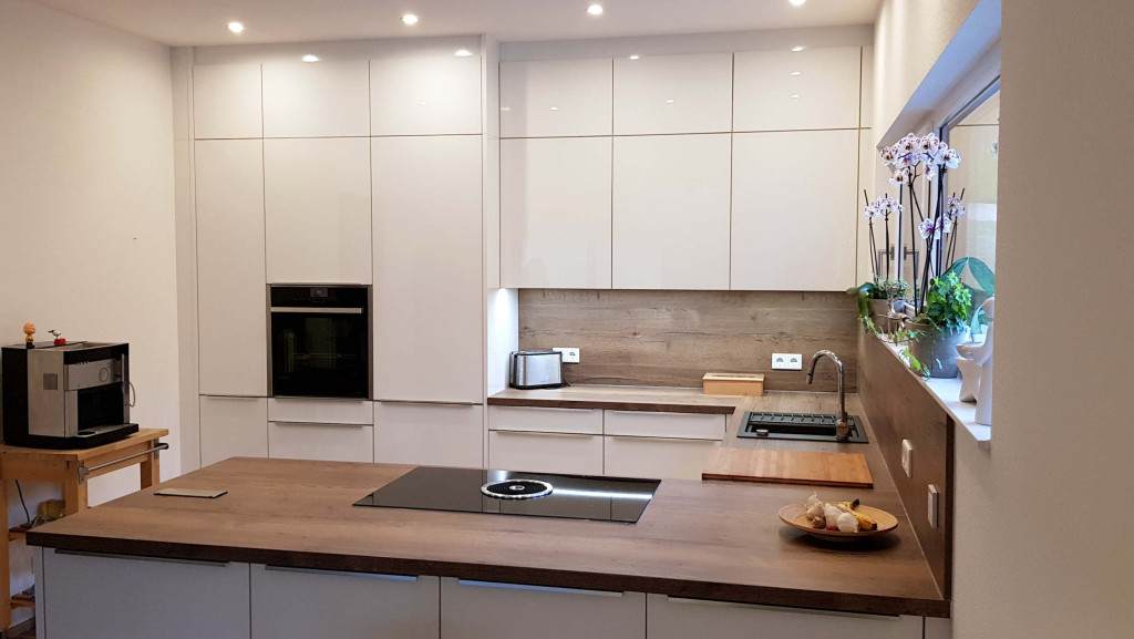 Diese Küche zeigt, dass man sich in der Gestaltung nicht an einen Stil halten muss, sondern auch kreativ verschiedene Elemente kombinieren kann. Die großen, schlichten Fronten, grifflosen Türen und klare Linien sorgen für einen modernen, puristischen Look. Die Arbeitsplatte aus Alteiche-Barrique und die passenden Rückwände verleihen der Küche Wärme und eine Atmosphäre, die man sonst eher vom modernen Country-Style kennt. Individuelle Lieblingsstücke wie der Esstisch aus Echtholz und der Apothekerschrank ergänzen den Raum und machen ihn zum perfekten Wohlfühlort!