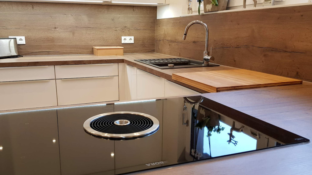 Herzstück dieser Küche ist die angegliederte Kücheninsel mit Kochfeld und integriertem Dunstabzug aus dem Hause BORA. Die Insel ist mit 986 Millimetern tiefer als eine normale Arbeitsfläche – perfekt, wenn mit mehreren Personen gleichzeitig in der Küche gewerkelt wird. Durch die zahlreichen integrierten Schubfächer ergibt sich maximaler Stauraum, so dass genug Platz ist für Kochutensilien und Lebensmittel.