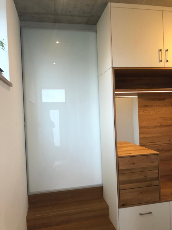 Ein richtiger Hingucker in dieser Garderobenplanung ist auch die versteckte Glasschiebetür. Diese trennt den Eingangsbereich flexibel vom Wohnraum ab und kann komplett im Garderobenschrank verschwinden. So entsteht im Handumdrehen ein großzügiger, offener Raum - flexibel und praktisch zugleich!