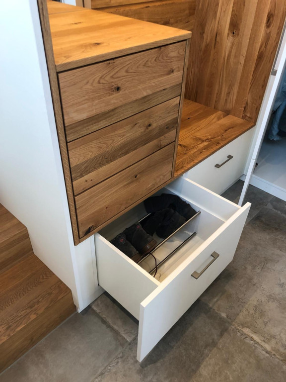 Die Nische in massiver geölter Eiche lässt den Eingangsbereich offener und wärmer wirken - und bietet zudem noch Platz zum Hinsetzen und Fertig-Machen, sowie weiteren Stauraum in den Schubläden und der Ablage.