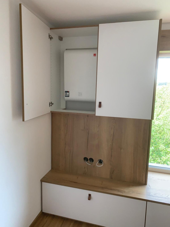 Mit diesem Projekt haben wir bewiesen, wie es geht! Die Sitzfläche des Fensters wurde erweitert, indem die Stauraumschränke daneben nahtlos an den Sitzplatz anschließen – und mit dem Abschluss über dem Fenster ein harmonisches Gesamtbild erzeugen.