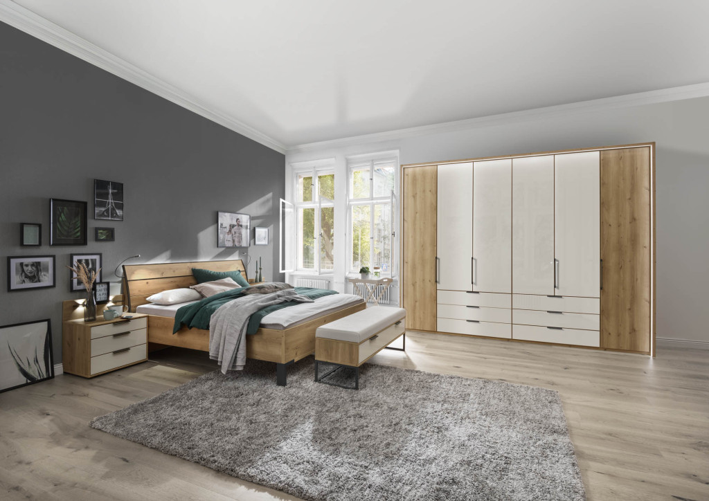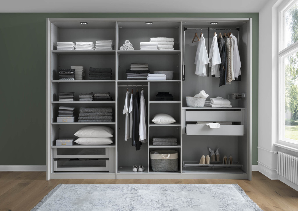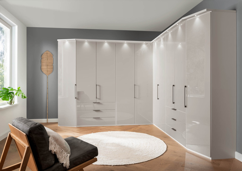 Das funktionale Schranksystem der Serie MONACO punktet mit frei zusammenstellbaren Korpus- und Frontausführungen. Entscheiden Sie sich für ein facettenreiches Dekor in Weiß, Champagner, Graphit, Kieselgrau oder Bianco-Eiche-Nachbildung, kombiniert mit Griffen in Chrom, Silber und Schiefer oder wählen Sie die Ausführung einer farbigen Glasfront, inklusive Kristallspiegel und einem harmonierenden Innenfarbton. Ob Drehtürenschränke, Falttürenschränke, voll ausgebaute Eckschränke mit zusätzlicher Kranzleiste, Abschlussschränke mit Drehtür oder passende Regalelemente - der Einrichtungsvielfalt sind mit der Möbelserie MONACO keine Grenzen gesetzt. Je nach Modell mit wechselseitig wählbaren Türanschlägen, mehrteiligen Auszügen und exklusivem Schrankzubehör versehen, weisen die Schrankelemente mit zwei Einlegeböden und einer Kleiderstange je Fach eine clevere Inneneinteilung auf.