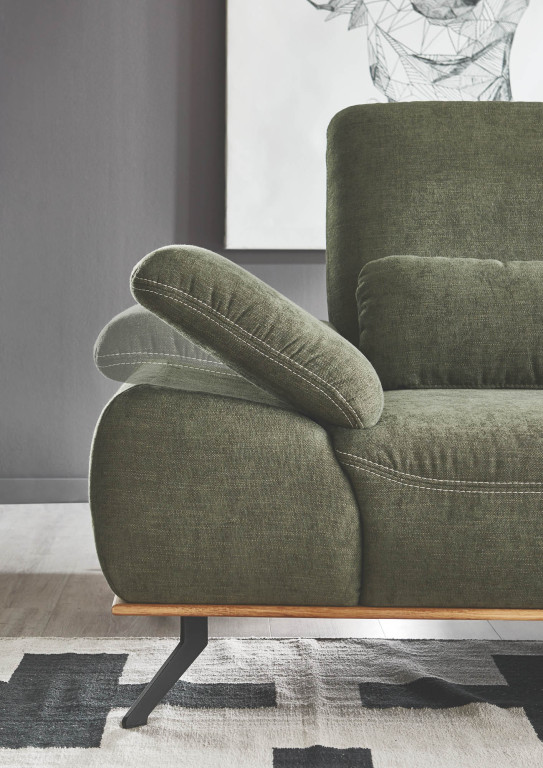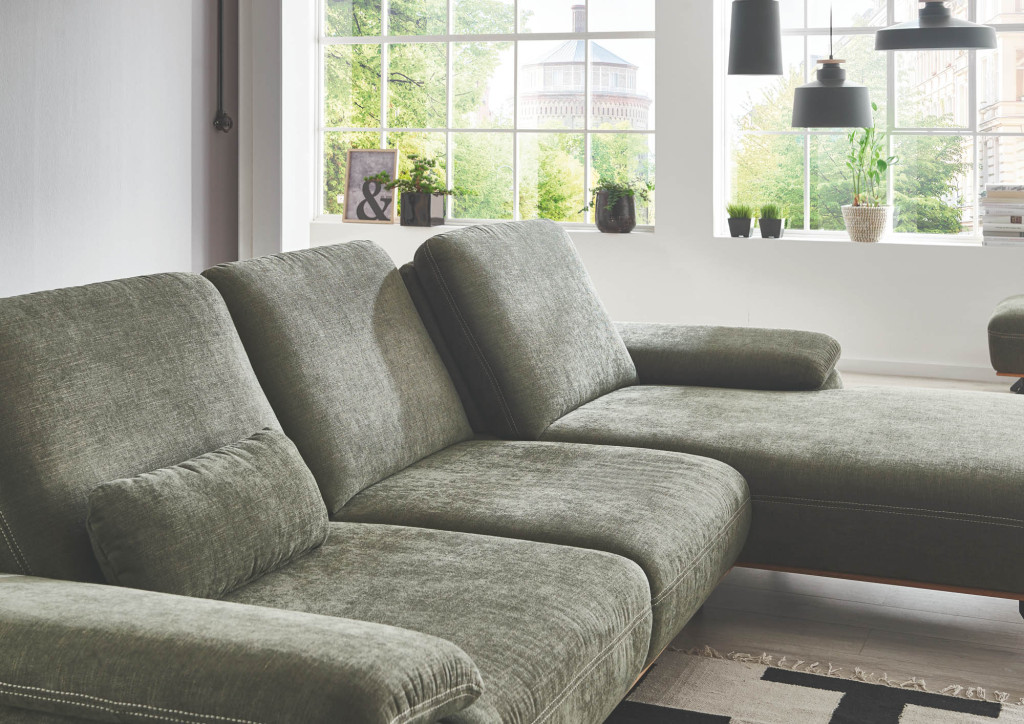Hochwertige Details wie die dekorative Doppelsteppnaht, auf Wunsch auch ohne Kontrastfaden, unterstreichen den handwerklichen Charakter. Dank der großen Stoff- und Farbauswahl, inklusive langlebiger Longlife‑Bezüge, lässt sich das Sofa perfekt an individuelle Stilvorlieben anpassen