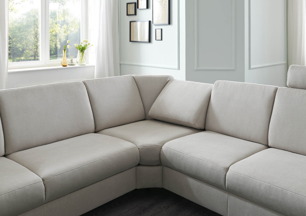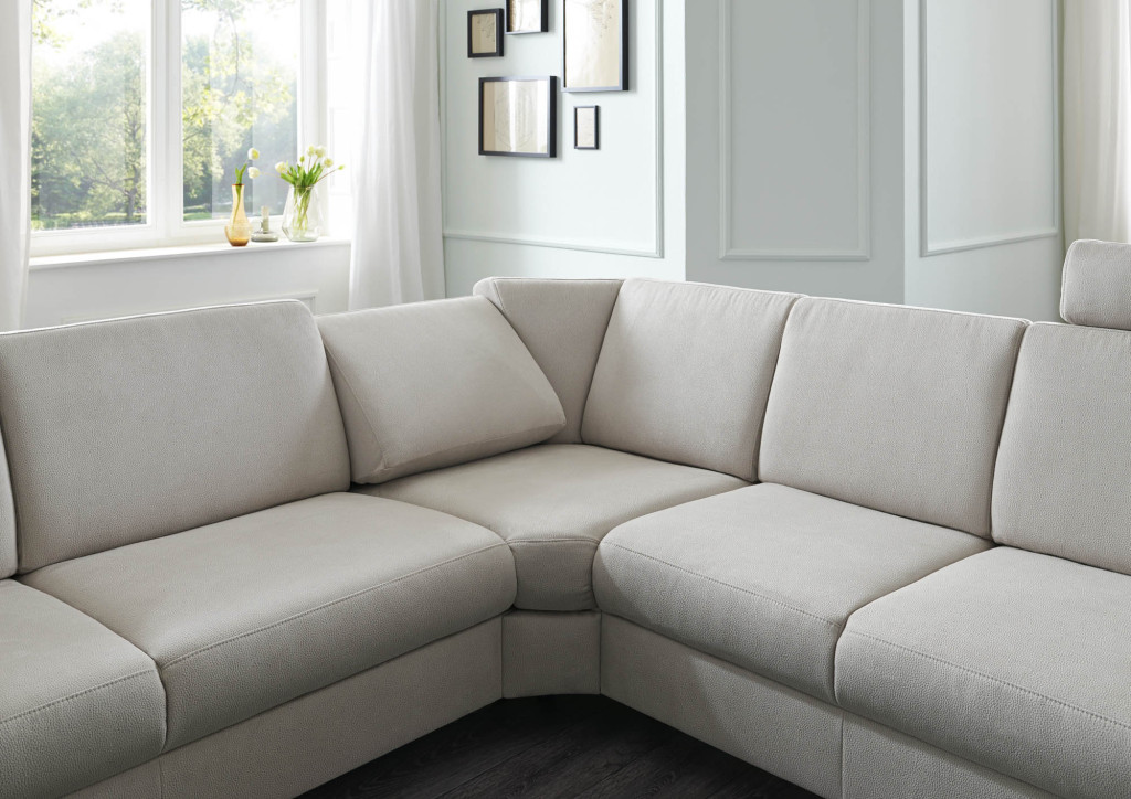 Flachgewebe, 100% Polyester, Farbe silver, Kaltschaum, Metallfüße hochglänzend, Sitzhöhe 44 cm, bestehend aus: 2,5-Sitzer, Armlehne links, BHT ca. 174/89/94 cm Rundecke, Rücken echt, BHT ca. 100/89/100 cm 2-Sitzer, Armlehne rechts, Rücken echt, BHT ca. 144/89/94 cm Stellmaß ca. 274x244 cm