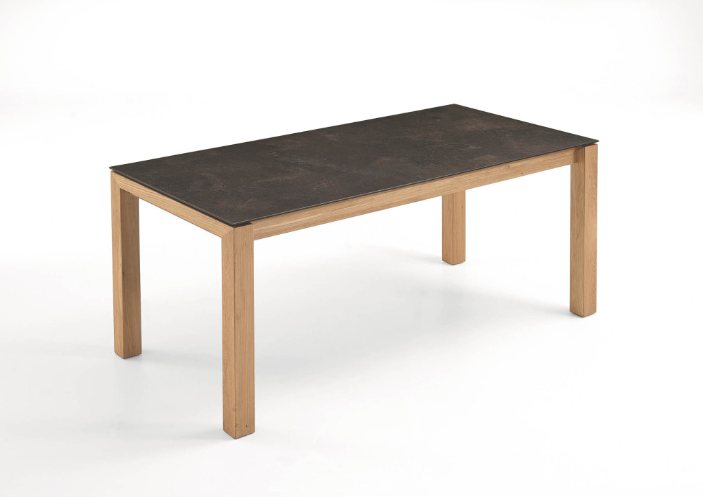 Tischplatte HPL Granit-Design, zwei innenliegende Klappeinlagen à 45 cm, Gestell und Zargen in Wildeiche massiv, geölt, LBH ca. 160(205/250)/90/75 cm