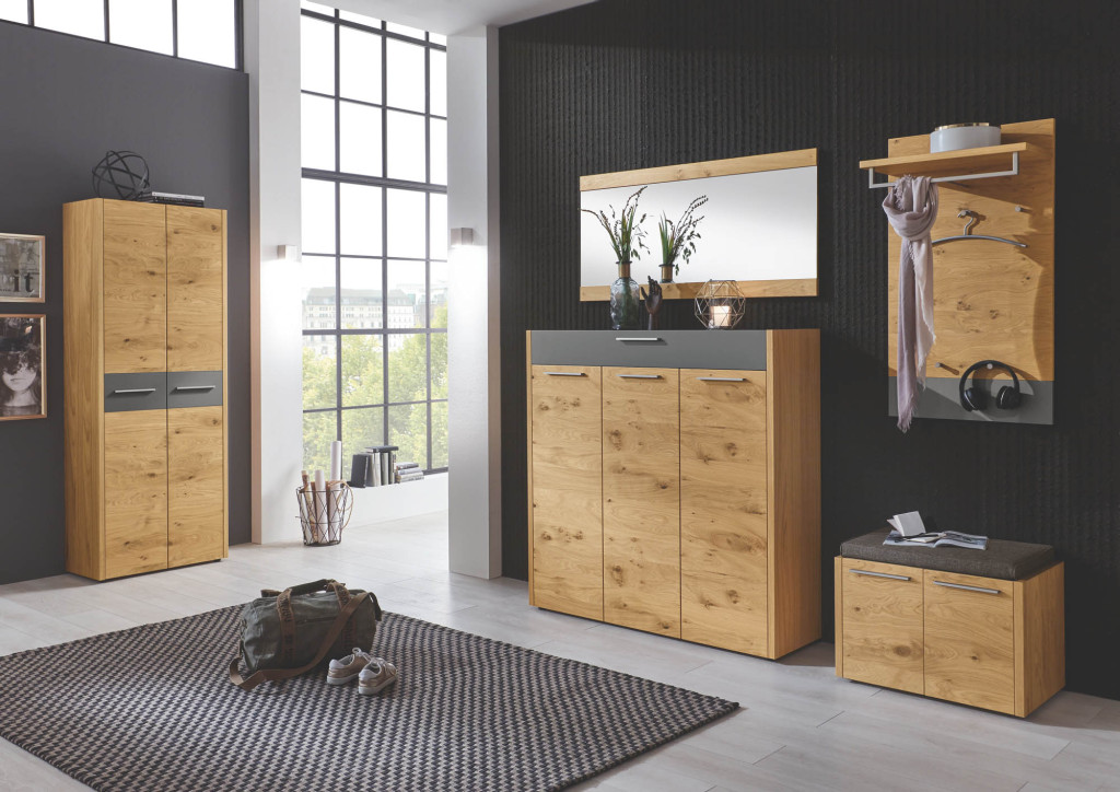 Fronten Balkeneiche furniert, Absetzungen Lack matt schwarz, Korpus Eiche bianco furniert, Beschläge schwarz, Schubkästen mit Vollauszug, bestehend aus: