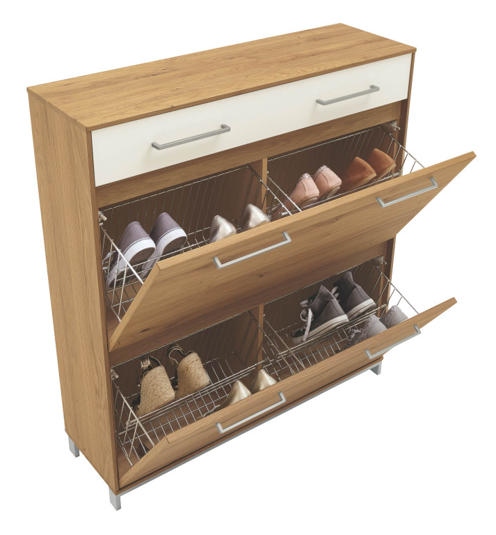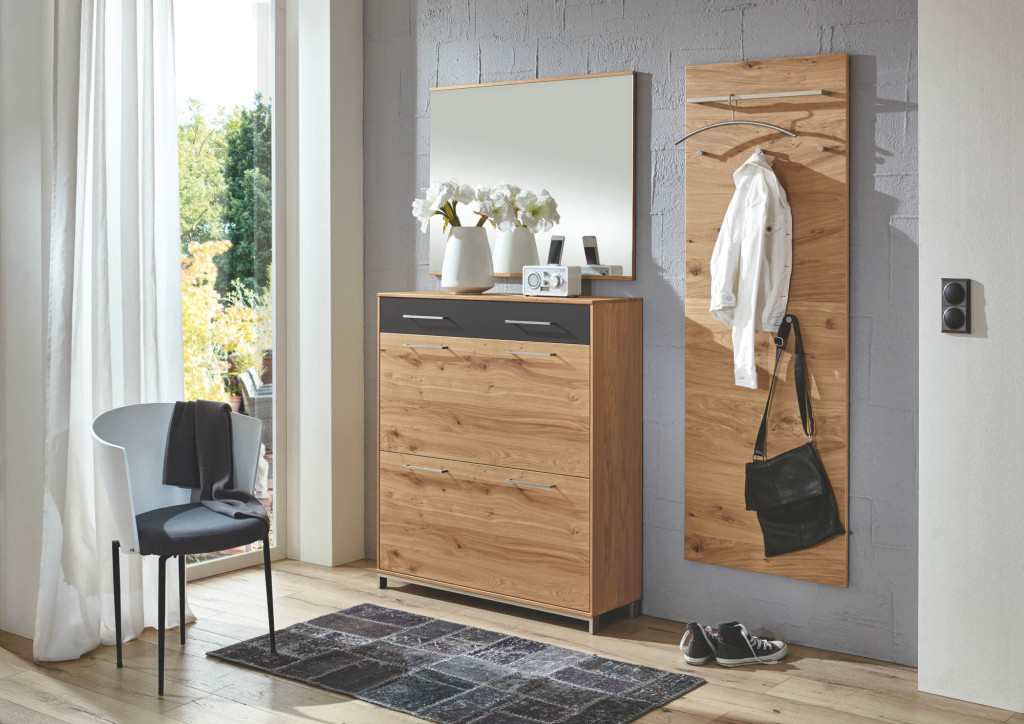 Korpus: Eiche teilmassiv Front: Balkeneiche furniert / Absetzung Mattglas Weiß -72 bestehend aus: 892-71 Garderobenpaneel, BHT ca. 42/183/27cm 873-72 Kommode, BHT ca. 86/105/37 cm 888-71 Spiegel, ca. 82/82 cm