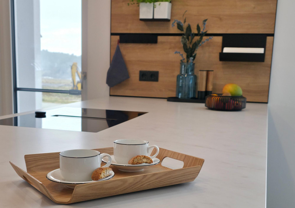 Der warme Holzton des Nischenrahmens wird an der Rückwand der angrenzenden Insel erneut aufgegriffen. Dadurch entsteht eine harmonische Verbindung der einzelnen Küchenelemente und ein stimmiges Gesamtbild.