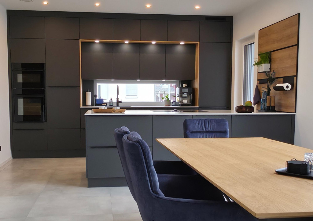 Die beleuchtete Nische rund um das Fenster lockert die deckenhohe Hochschrankwand auf und lässt zusätzlich natürliches Licht in den Raum. Trotz der dunklen Fronten wirkt die Küche so hell, freundlich und äußerst einladend.
