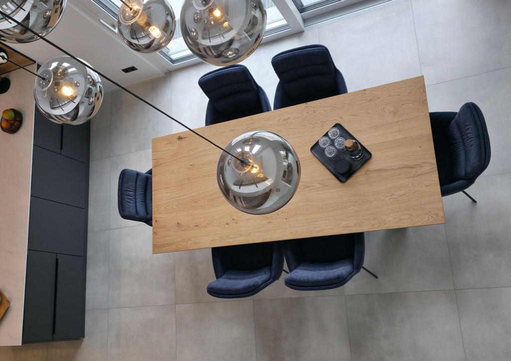 In Szene gesetzt wird der Essbereich von der hängenden Beleuchtung, die auf jeden Fall ein Highlight darstellt.