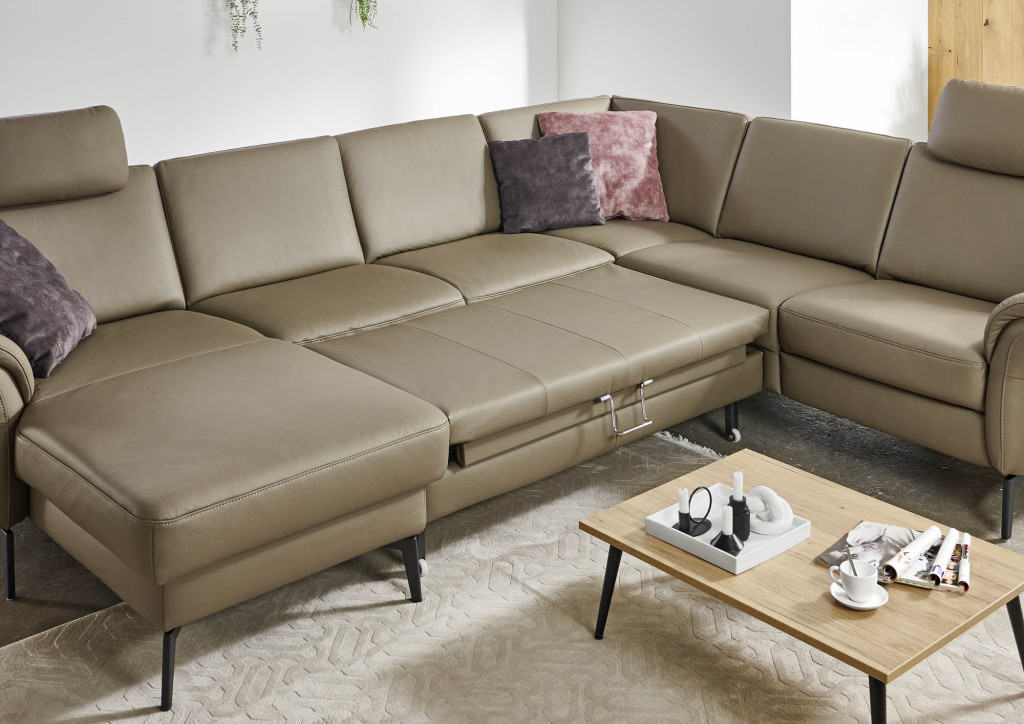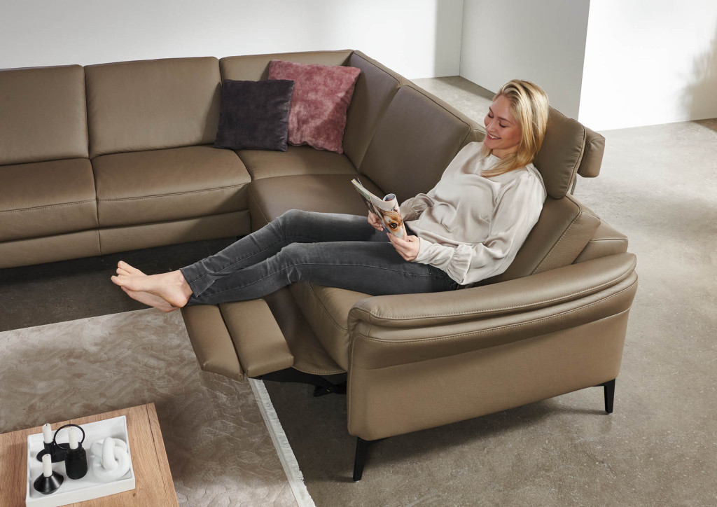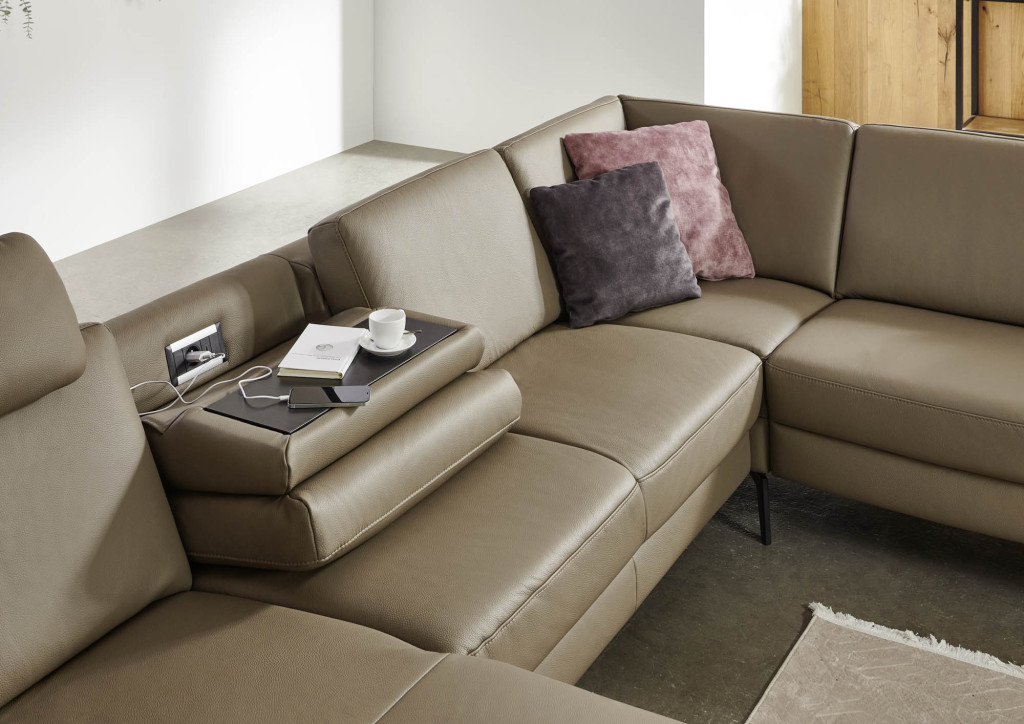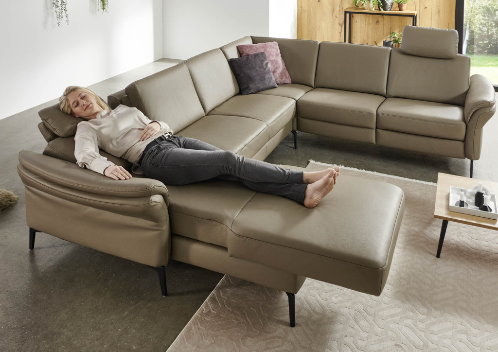 Diese moderne Wohnlandschaft bietet hohen Komfort und individuelle Anpassungsmöglichkeiten durch verschiedene Sitzqualitäten, Sitzhöhen, Fußvarianten und eine große Auswahl an Bezügen. Die motorische WallFree‑Relaxfunktion ermöglicht eine bequeme Liegeposition, ohne das Sofa von der Wand abrücken zu müssen, da sich der Sitz sanft nach vorn bewegt. Eine integrierte Funktionsablage bietet eine praktische Abstellfläche und kann je nach Ausführung mit Steckdose oder USB‑Ladepunkt ausgestattet sein. Ergänzende Funktionen wie motorischer Canapé‑Auszug, Relaxrücken und aufklappbare Hockerelemente machen das Sofa zu einer vielseitigen und komfortablen Lösung für jeden Wohnraum.