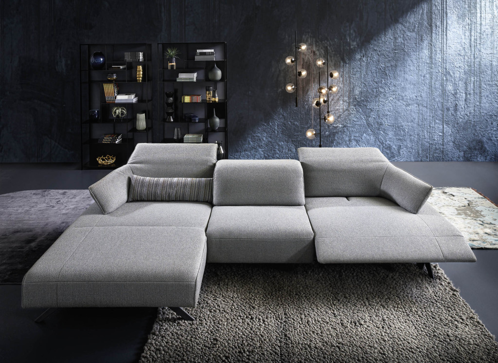 Die erhöhte Bodenfreiheit sorgt für eine leichte, elegante Optik, während die elektrisch ausklappbare Beinauflage zusätzlichen Komfort bietet. Über einen seitlichen Kippschalter lässt sich die Relaxposition mühelos einstellen. Integrierte Kopfstützen erhöhen den Sitzkomfort und runden das durchdachte Gesamtbild ab.