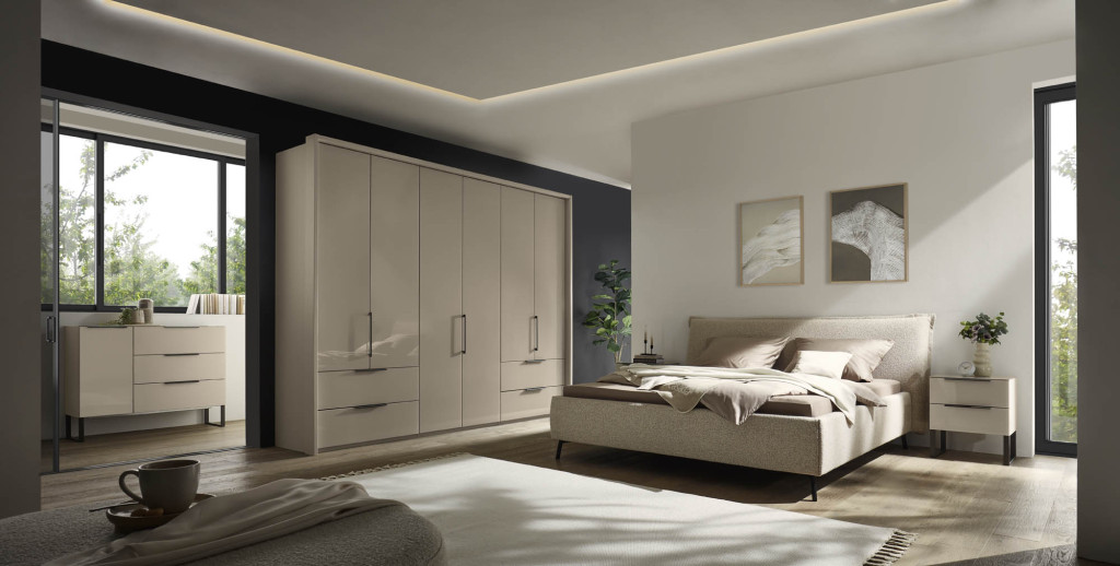 Das Schrankprogramm C1-125 von Casada verbindet zeitlose Eleganz mit moderner Klarheit. Fronten in Glas in 3 verschiedenen Farbtönen sorgen für ein edles Erscheinungsbild, das durch die optionalen Spiegeltüren zusätzlich aufgelockert wird. So entsteht ein harmonisches Möbelstück, das Schlafzimmern eine stilvolle Leichtigkeit verleiht.