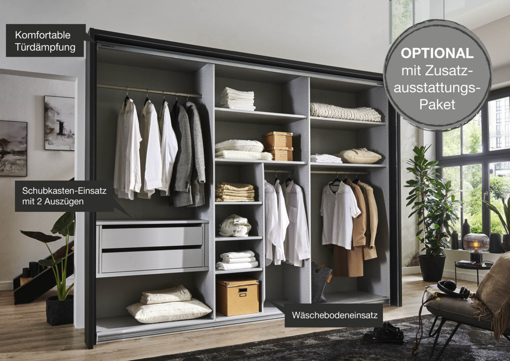 Korpus graphit-Dekor, Außentüren graphit-Dekor, mittlere Tür in graphit-Dekor mit Lamellen in Bianco-Eiche Nachbildung, Griffleisten in graphit-Dekor, 3-türig, BHT ca. 300/217/67 cm