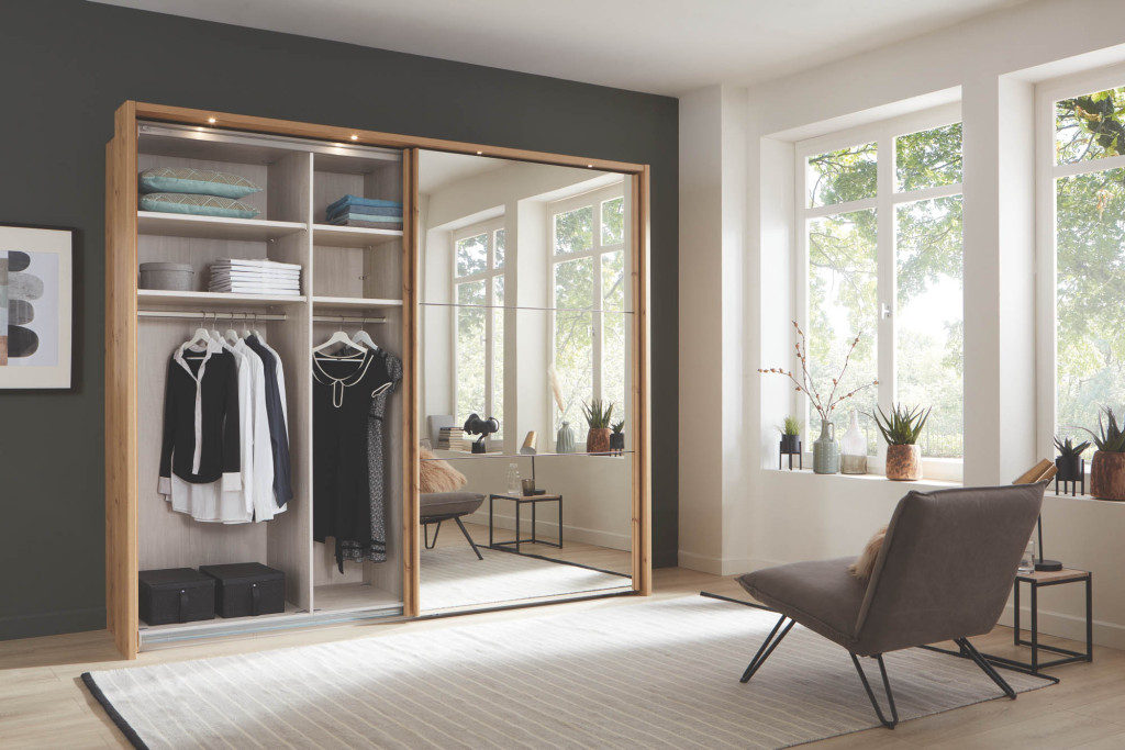 Unser hochwertiger Schwebetürenschrank mit zwei Türen vereint stilvolles Design und praktische Nutzung. Erhältlich in zwei Höhen und vier Breiten, passt sich dieser Schrank perfekt Ihren individuellen Raumverhältnissen an. Die Fronten sind in diversen Farben erhältlich und bieten Ihnen die Möglichkeit, den Schrank nach Ihrem Geschmack zu gestalten. Auch der Korpus kann in verschiedenen Farbtönen gewählt werden, um ein harmonisches Gesamtbild zu schaffen. Ein umfangreiches Beimöbelprogramm ergänzt das Angebot und ermöglicht eine perfekte Abstimmung Ihrer Einrichtung. Setzen Sie Akzente in Ihrem Schlafzimmer oder Ankleidezimmer und genießen Sie gleichzeitig großzügigen Stauraum sowie höchsten Komfort. Entdecken Sie die Vielfalt unserer Konfigurationsmöglichkeiten und gestalten Sie Ihren persönlichen Traum-Schwebetürenschrank!