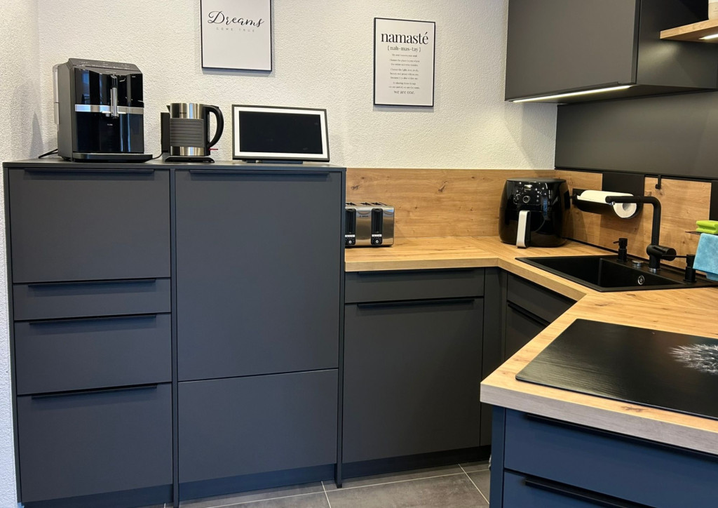 Mit dieser modernen Küchenplanung im eleganten Mattschwarz durften wir einem offenen Wohnkonzept zu einer neuen, strukturbildenden Mitte verhelfen. Das Herzstück der Gestaltung ist die deckenhohe Hochschrankwand, die als intelligenter Raumtrenner zum Eingangsbereich fungiert. Während sie zur Küche hin maximalen Stauraum bietet, verbirgt sich auf ihrer Rückseite eine die Garderobe (wenn ihr euch dafür auch interessiert dann schaut doch gerne mal in unseren Referenzen aus der Schreinerei vorbei)