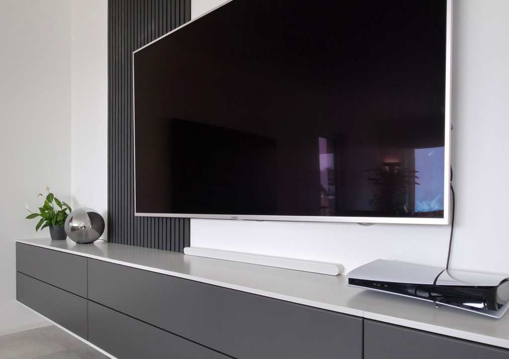 Ein besonderes Highlight ist das TV‑Lowboard mit schwebender Optik, das sich harmonisch in den Wohnraum einfügt. Die klaren Linien, hochwertige Materialien und die Kombination aus matten Oberflächen und strukturiertem Wandpaneel schaffen eine elegante und zugleich wohnliche Atmosphäre.
